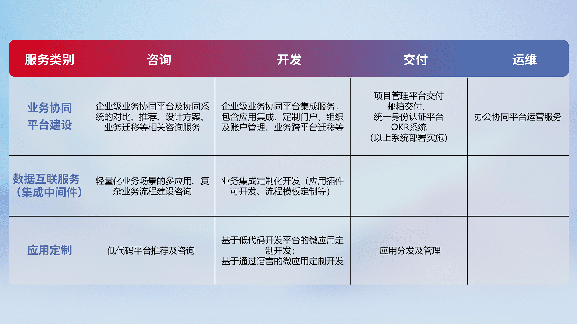 针对钉钉、、、、企微、、IDaas等平台级产品提供产品的规划、、、方案、、交付、、定制化开发等服务,,实现如统一协同办公、、、、智能客户服务、、混合会议管理、、智能数据查询、、、等业务场景,,实现数字化转型。。。。